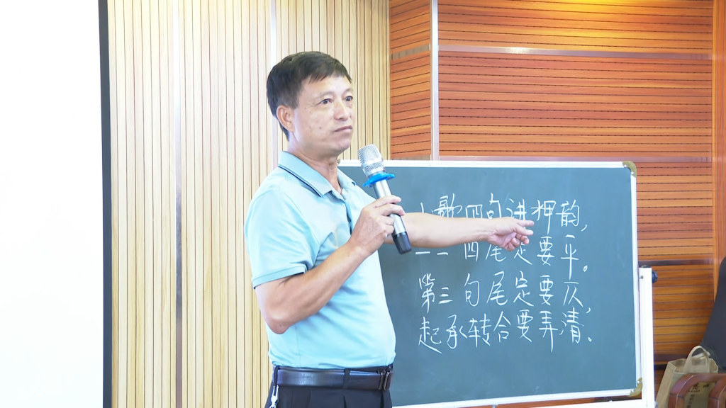 课程围绕编歌要领和注意事项、广西山歌常用韵脚、修辞手法等山歌创作理论知识,系统讲述山歌平仄规律、节奏感、赋比兴在山歌创作的运用,起承转合、对偶与排比结构等山歌艺术创作方法。