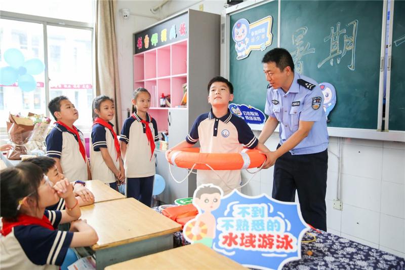 在防溺水教育环节,民警叔叔通过示范,向孩子们展示救生圈和救生衣的正确使用方法,并提醒、告知孩子们不要在江河湖塘等区域嬉戏打闹、不私自下水游泳等安全事项。