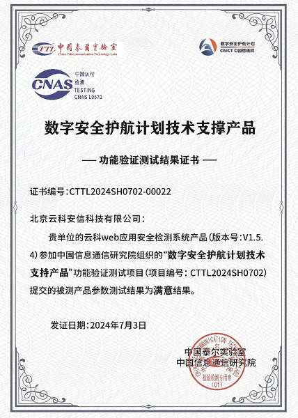 日前,2024全球数字经济大会——数字安全生态建设专题论坛(以下简称“论坛”)在京召开。论坛上,中国信息通信研究院为首期数字安全护航计划技术支撑产品颁发功能验证证书,云科安信web应用安全检测系统、全域应用风险防护系统两产品同时获评该项殊荣。