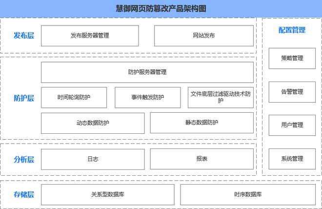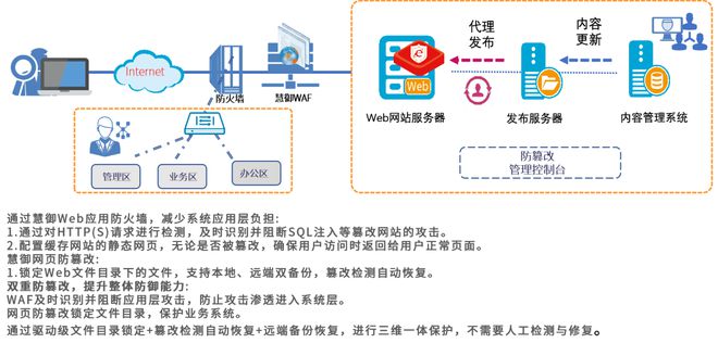 慧御网页防篡改系统采用的系统驱动级文件保护技术,监测非法篡改行为,并对被篡改文件进行恢复,主要包含管理端,防篡改端、发布端。