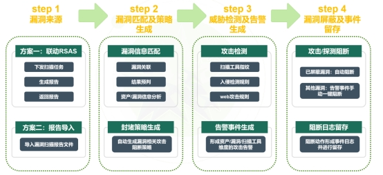 漏洞无效化技术,助力消除高危漏洞风险短期无法修复风险:基于扫描工具的指纹特征进行识别,自动进行会话阻断,并同时生成自动阻断规则,最终实现基于扫描IP的持续生效的阻断指令;基于漏洞维度的精准防护能力,自动匹配资产漏洞及攻击信息,形成针对高危漏洞的自动化防护。
