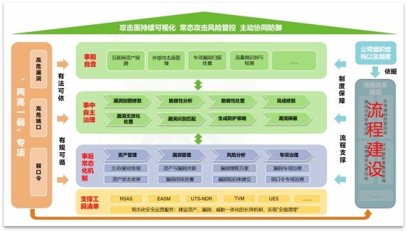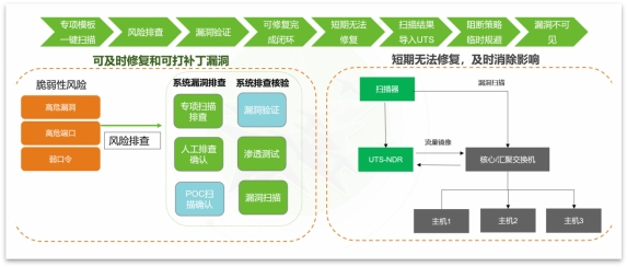 在自主检查阶段发现风险或上级监管机构下发整改通报后,开展风险自主治理,并完成闭环管理。在资产关联、风险排查基础上,针对能够整改的风险进行整改加固;针对无法整改的漏洞,漏洞无效化等技术手段降低或消除漏洞被利用的可能性,消除漏洞影响。